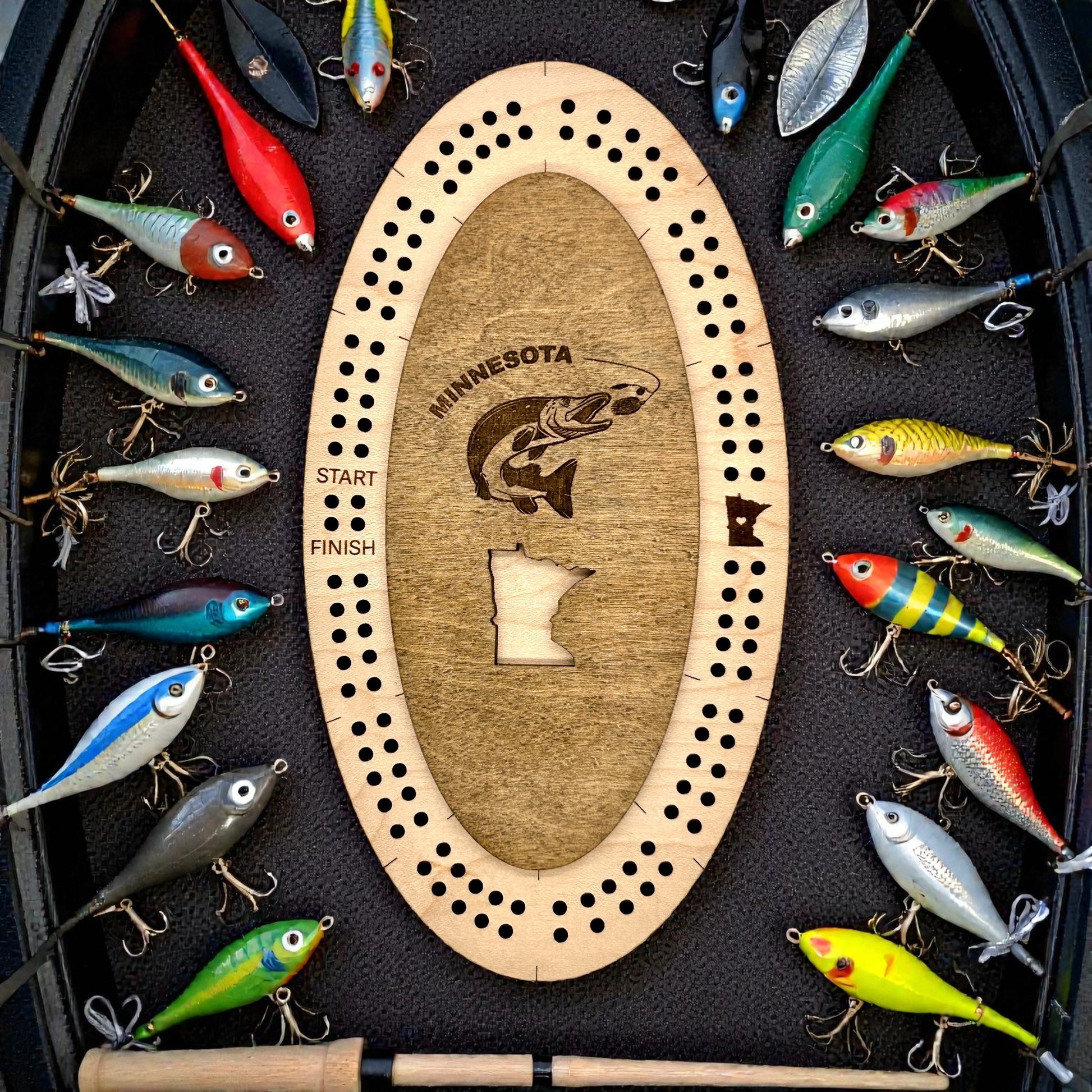 MN/WI themed half size cribbage board for a quick game on the go or for a full game. Magnetic top securely stores the 4 included cribbage pegs.